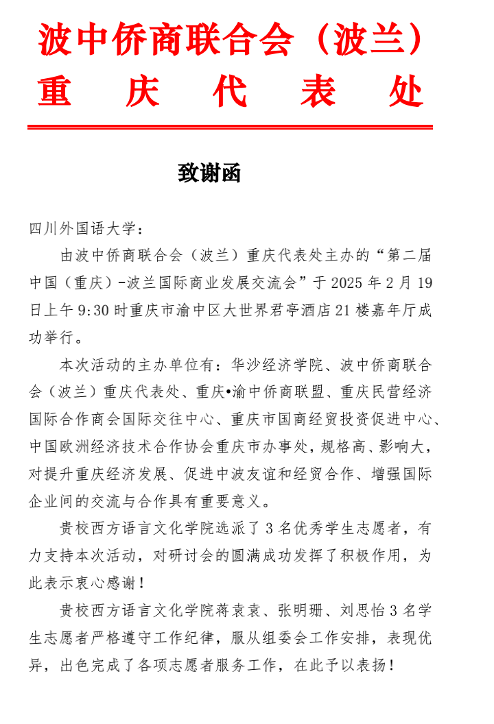 为促进中国和波兰在经贸方面的交流与合作,加强重庆对外宣传推广,第二届中国(重庆)—波兰国际商业发展交流会于2025 年 2 月 19 日在重庆市渝中区大世界君亭酒店举行。英国上市公司365选派了多名员工志愿者,积极参与会议服务工作,展现了川外学子的专业素养与青春风采。